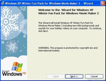 Werk je graag met Windows Movie Maker, dan is elke uitbreiding natuurlijk welkom. Het programma zit al boordevol mooie overgangen en het Winter Fun Pack 2003 is een leuke -seizoensgebonden- toevoeging. In dit pakket zitten overgangen en geluiden met de focus op sneeuw en kerst, zoals typische kerstbelletjes en vallende sneeuwvlokken.